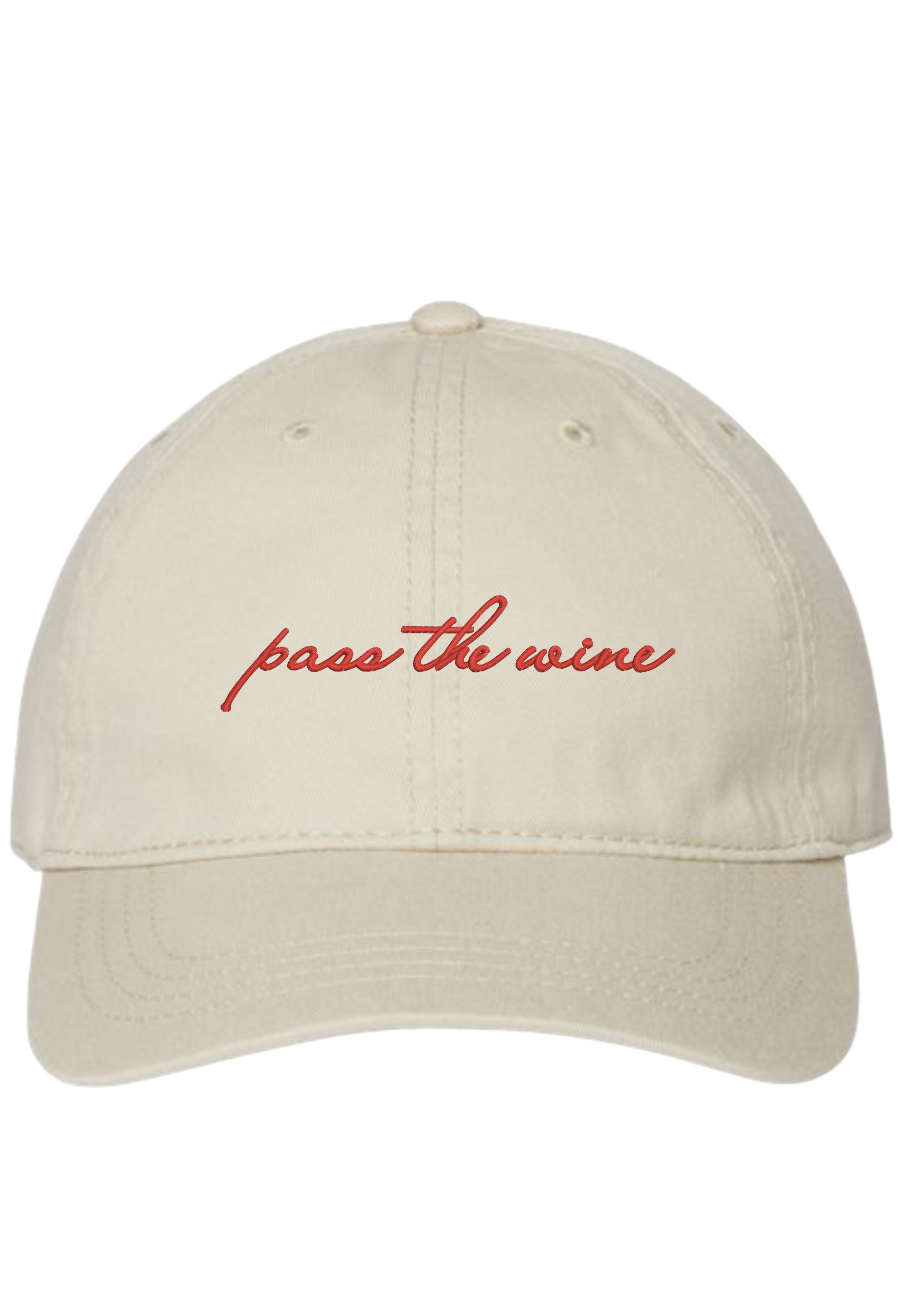 We don't want to ruin the surprise, but we think you just found your new favorite hat. Featuring an off-white hat with red embroidered "pass the wine" text.
