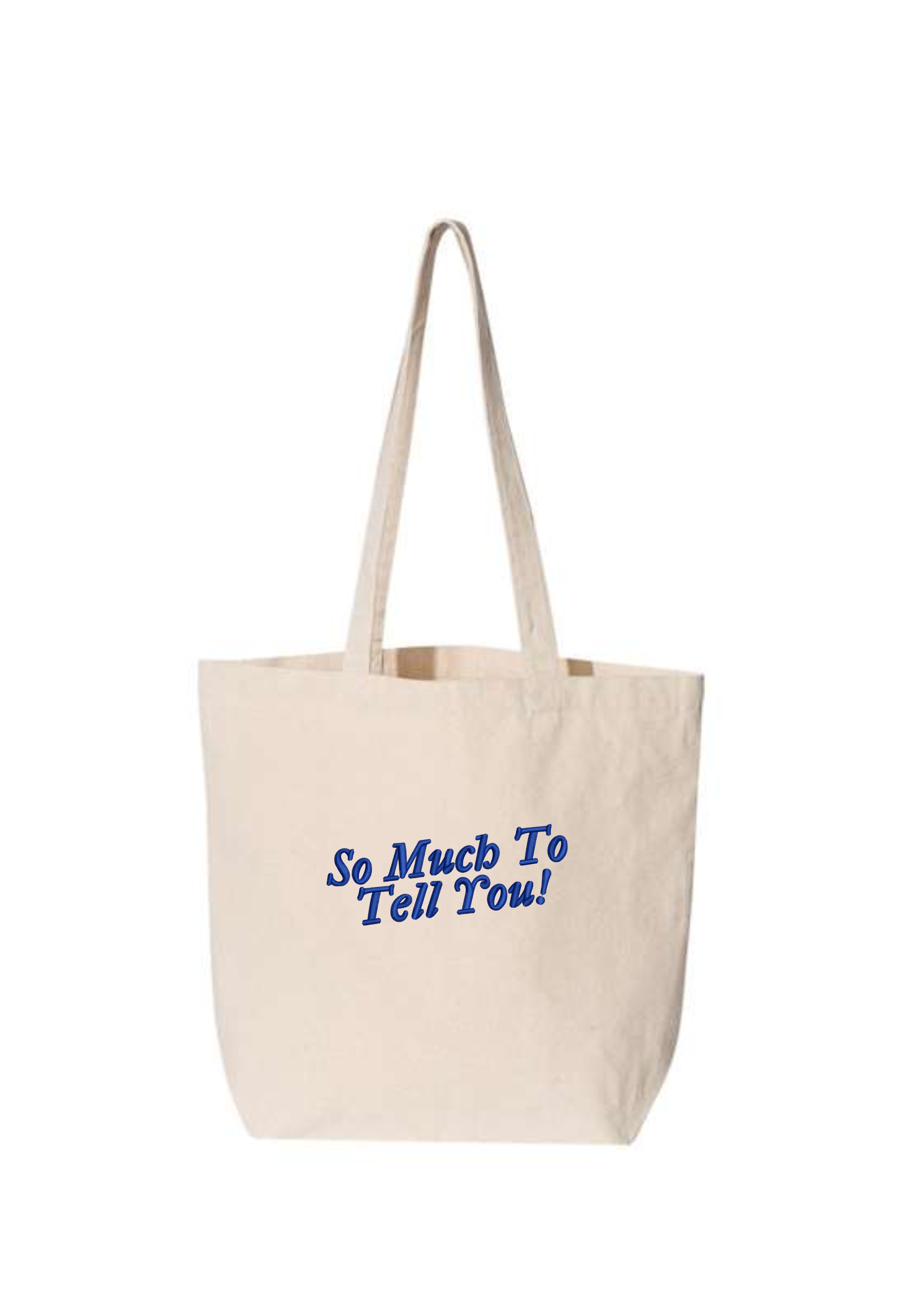 Sit down, stay a while! Our favorite tote bag, featuring our logo, "So Much To Tell You!" embroidered in a rich blue thread.