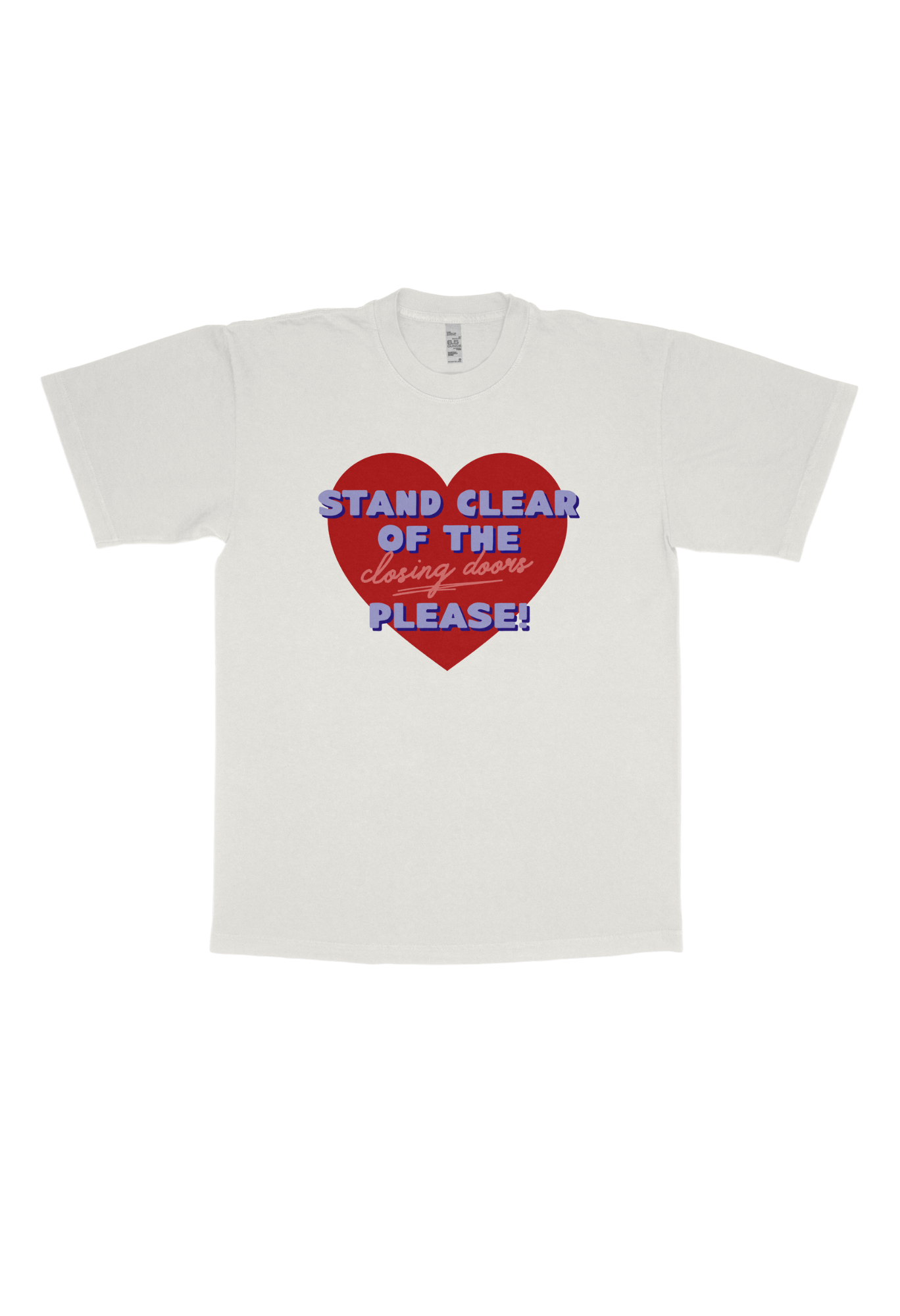 New York is special with every little detail. Featuring a heart background with "Stand clear of the closing doors please" in bold letters on our classic off white t-shirt.