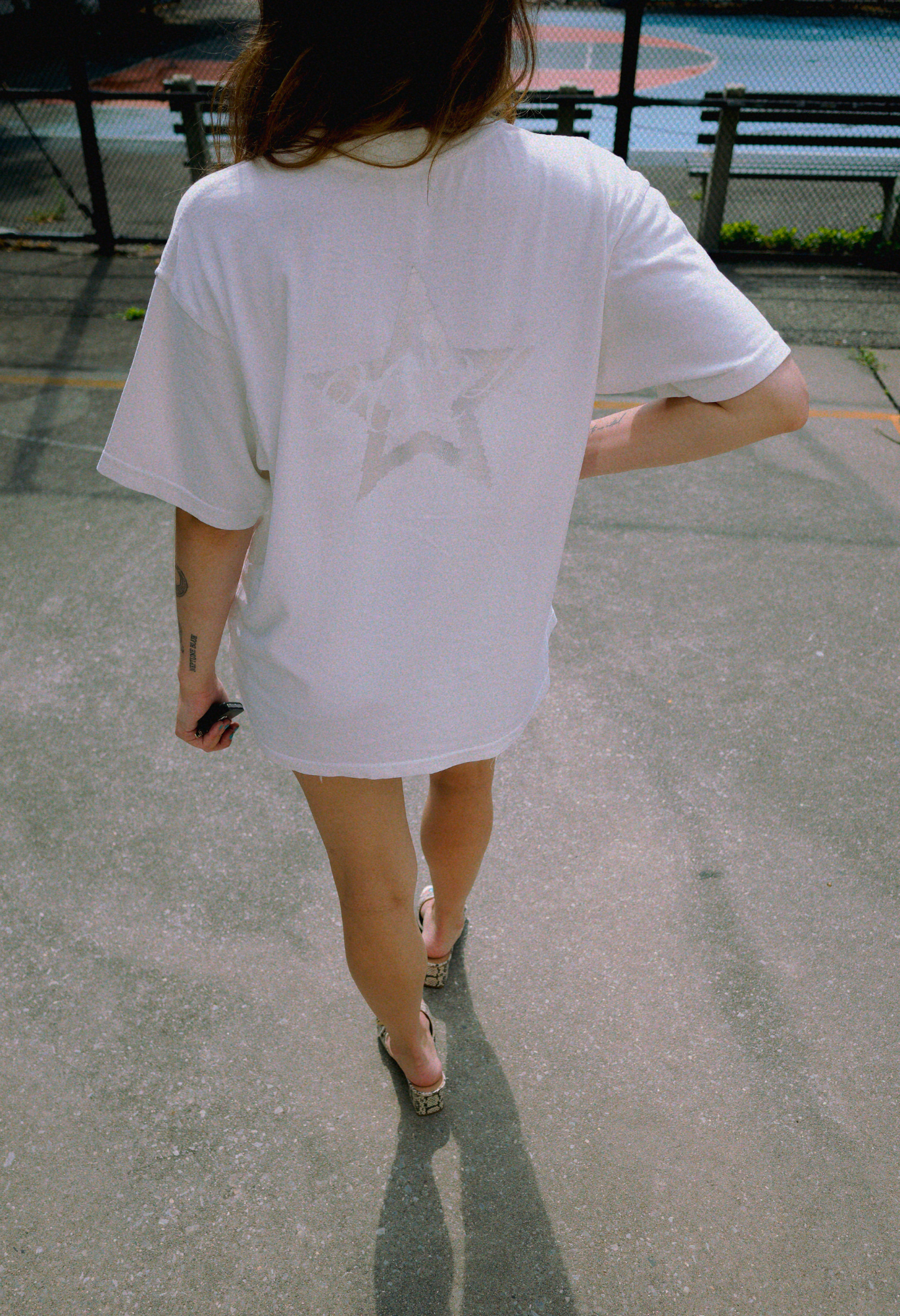 Silver metallic print with a star outline on the back, featuring white 2024 text so the cool kids can find it in your closet and say it's vintage one day.