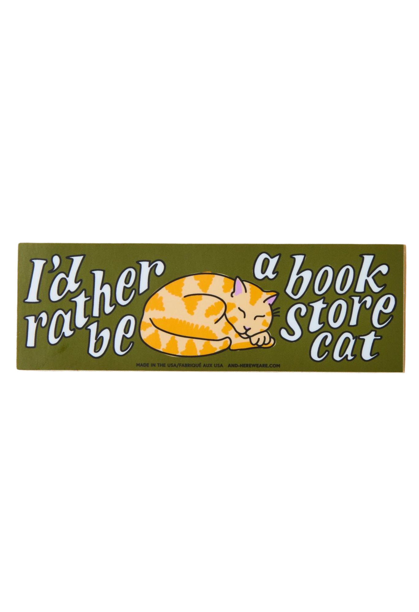 Green bumper sticker with an orange cat that says "I'd rather be a book store cat" Green bumper sticker with an orange cat that says "I'd rather be a book store cat"